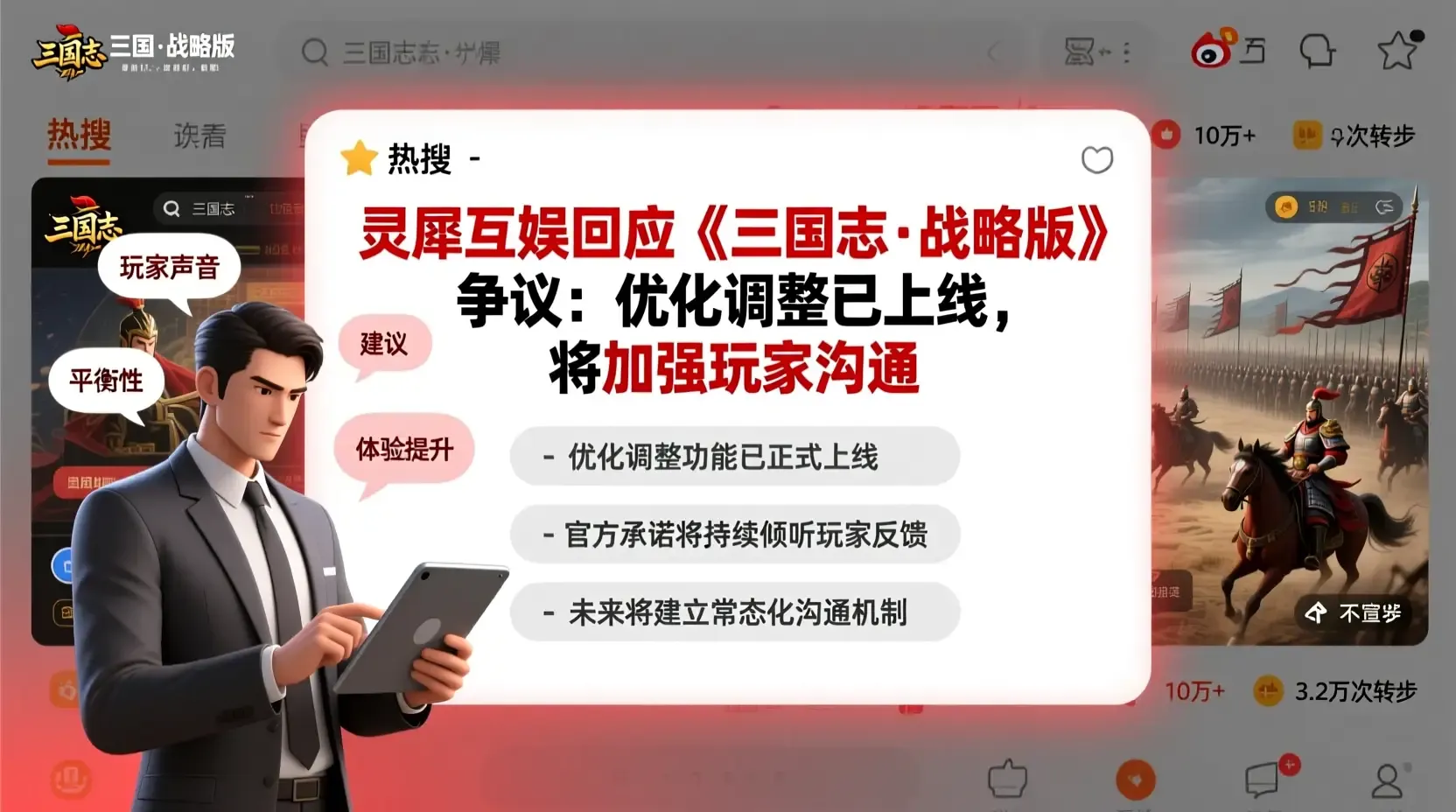 近日,灵犀互娱旗下旗舰产品《三国志·战略版》因版本更新内容引发玩家群体广泛讨论,相关话题持续登上微博热搜榜。针对玩家反馈的核心问题,灵犀互娱于2026年1月14日正式发布官方声明,回应近期争议,并公布了一系列优化措施。