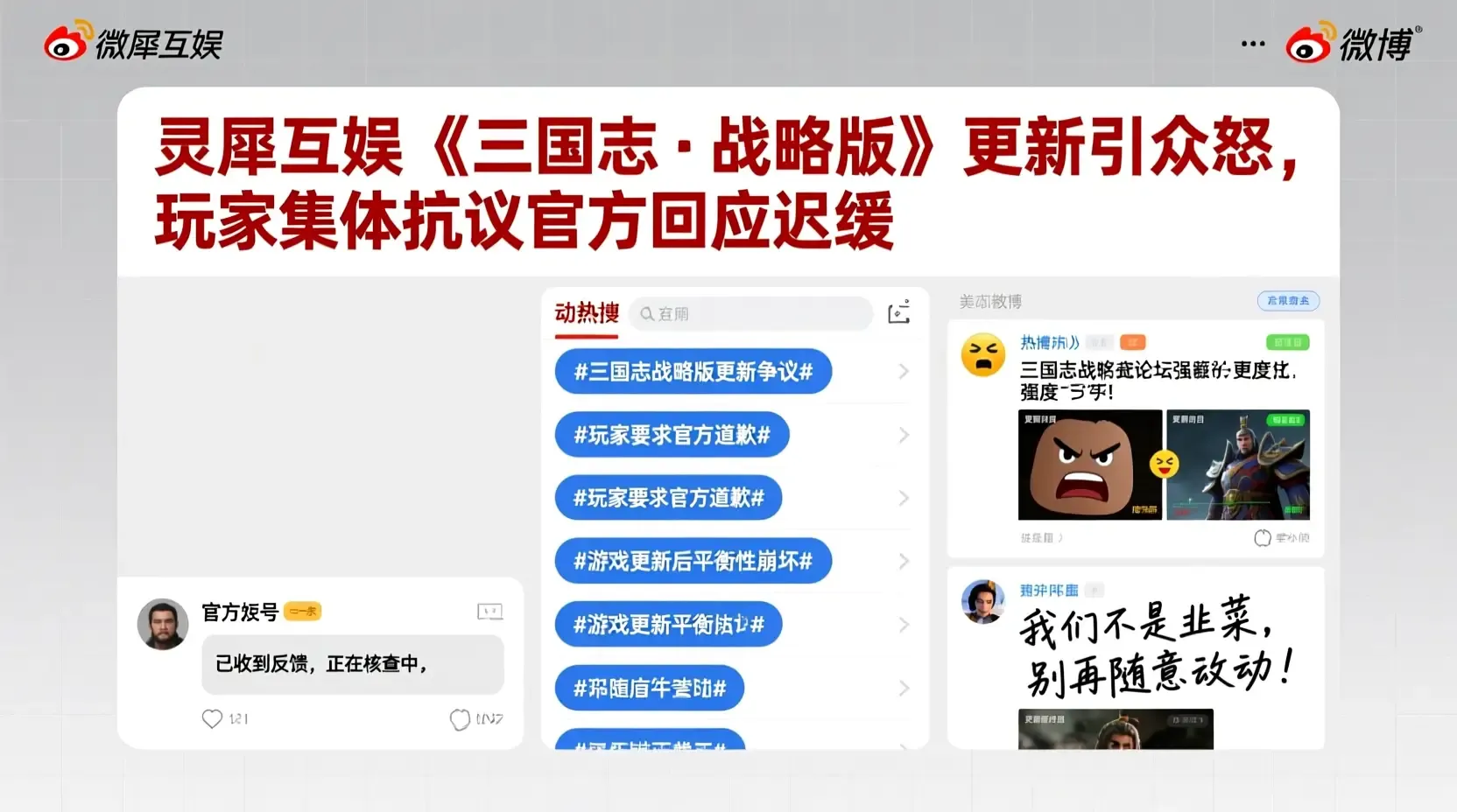 类似的声音在微博、贴吧和TapTap等平台集中爆发,相关话题#三国志战略版崩了#、#灵犀互娱背刺玩家#阅读量累计突破3亿次,评论区中大量玩家表达失望与愤怒,部分用户甚至宣布“退游”以示抗议。